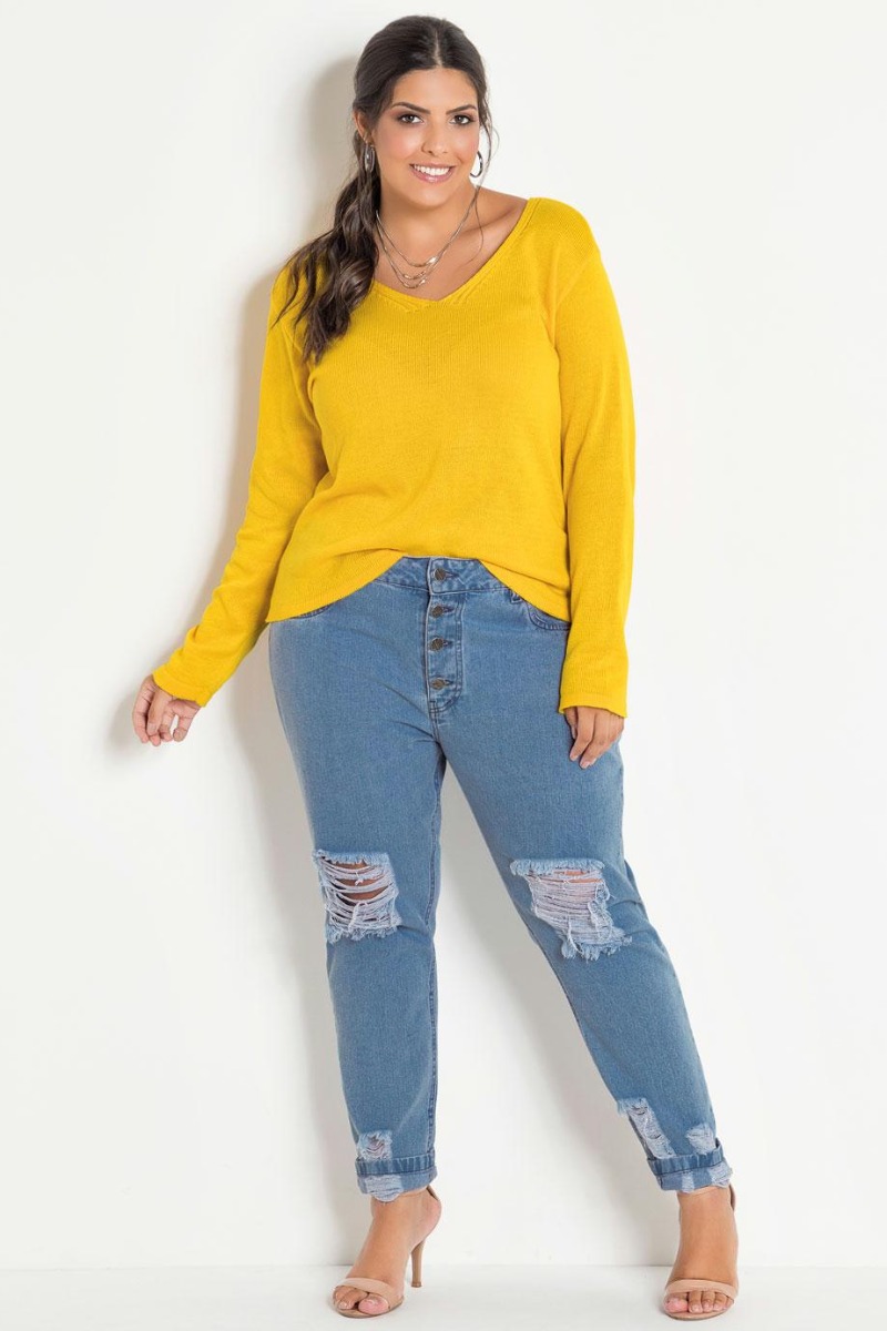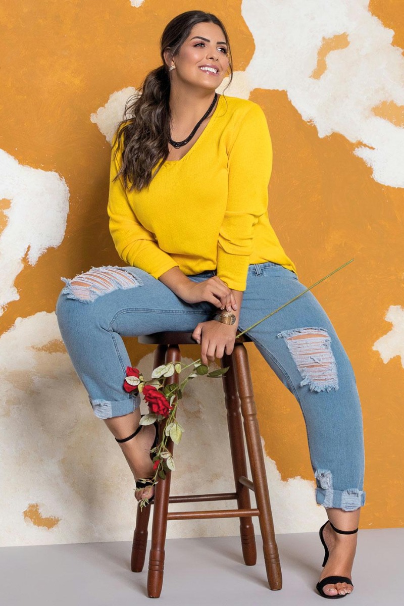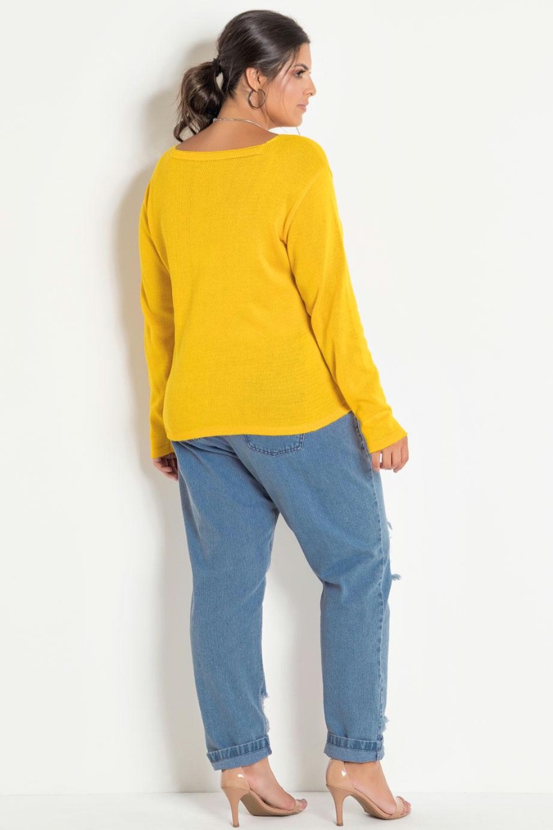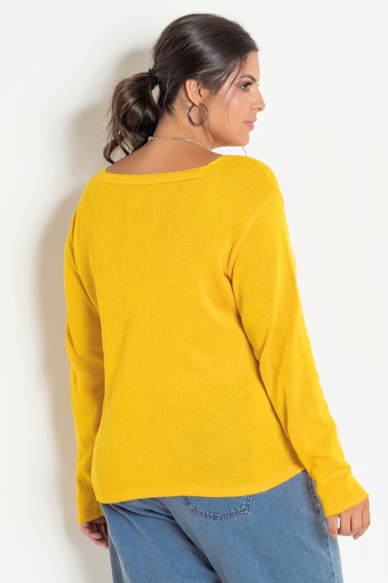 Blusa Tricô Decote V Amarela Plus Size da Marca 5 na cor Amarelo